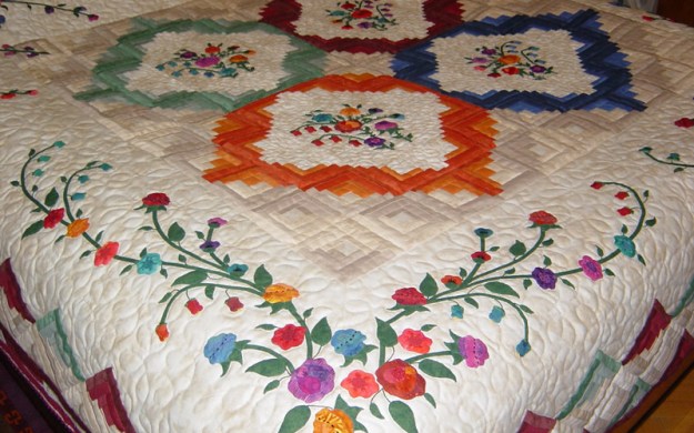 | Techniques | Applique, log cabin, cut-away applique, embroidery techniques (log cabins with machine, rest is hand made) | |
