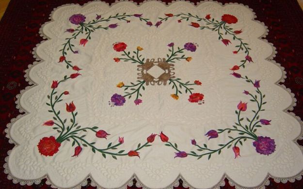 | Artist’s comments | This decorative table cloth is really catchy with its vivid colors. I wanted it to reflect the classical Ottoman style, with tulips and carnation. The hardest part of this work was the boutisse in the background. But I’m glad I utilized it in this piece, as the “third dimension” adds so much reality to the artwork. I have aimed to create a piece both contemporary and antiquated, using the classical Ottoman art figure “tulip”. I have accentuated this bipolarity in the colorization: both modern and classical; accomodating east and west; seperate but connected, different yet harmonius… I would like to express my special thanks to Mrs. Huri Gencay who has made the needle lace in the framing of this piece. |