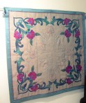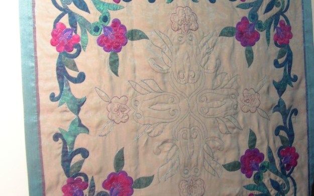 | Artist’s comments | This work takes one away to a dreamland with both it’s color range and delicate texture. The organza, being variegated, creates the illusion of different colors and sparkles from different views. The slickness of the organza and silks are hard to work with, although the resulting beauty is worth all the trouble imho. |